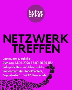 13. Januar 2026 Netzwerktreffen Kulturakteure Barnim, Rofinpark, Haus 57, Eberswalde, 17 Uhr ankommen, 17.30 bis 19.30 Uhr